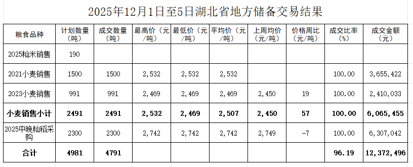 本周湖北贸易粮交易采购成交2070吨2025年中晚籼稻,成交率100%,成交均价2820元/吨
